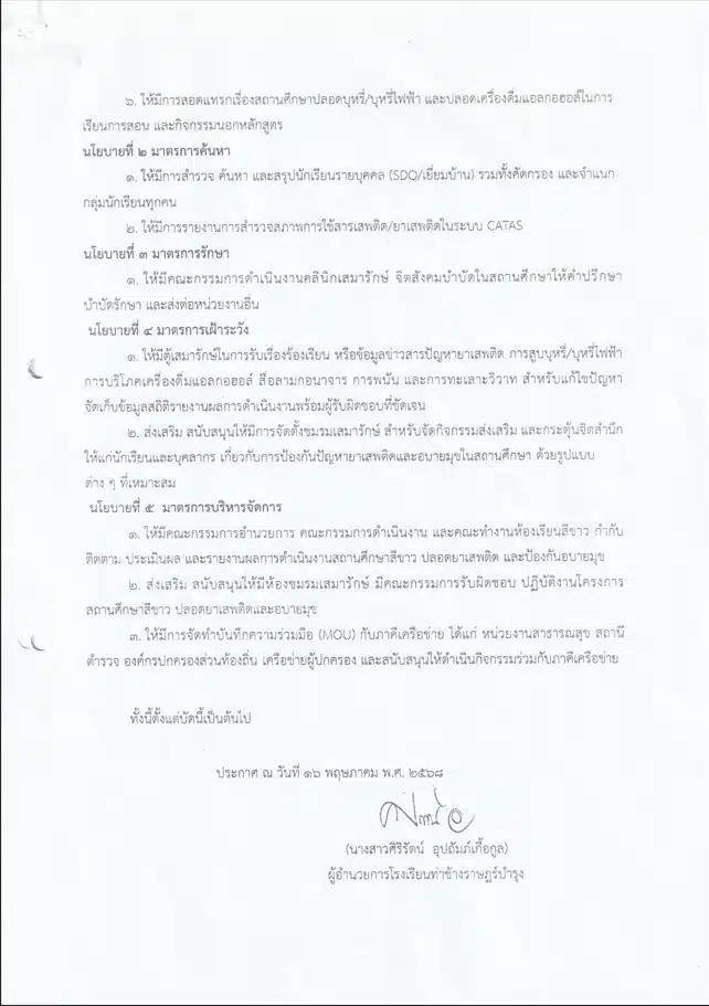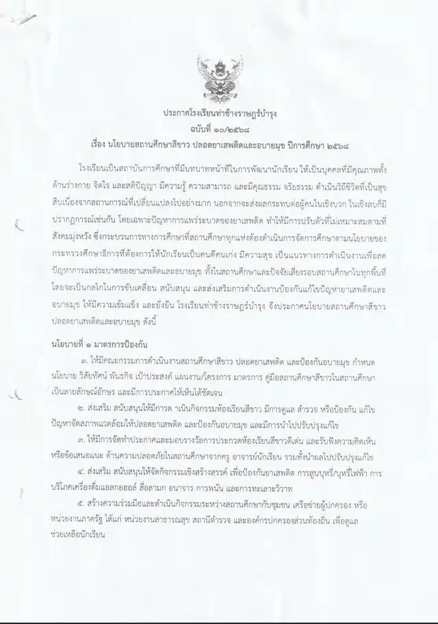 ประกาศโรงเรียนท่าช้างราษฎร์บำรุง เรื่อง นโยบายสถานศึกษาสีขาว ปลอดยาเสพติดและอบายมุข ปีการศึกษา 2568By thachang / June 25, 2025
